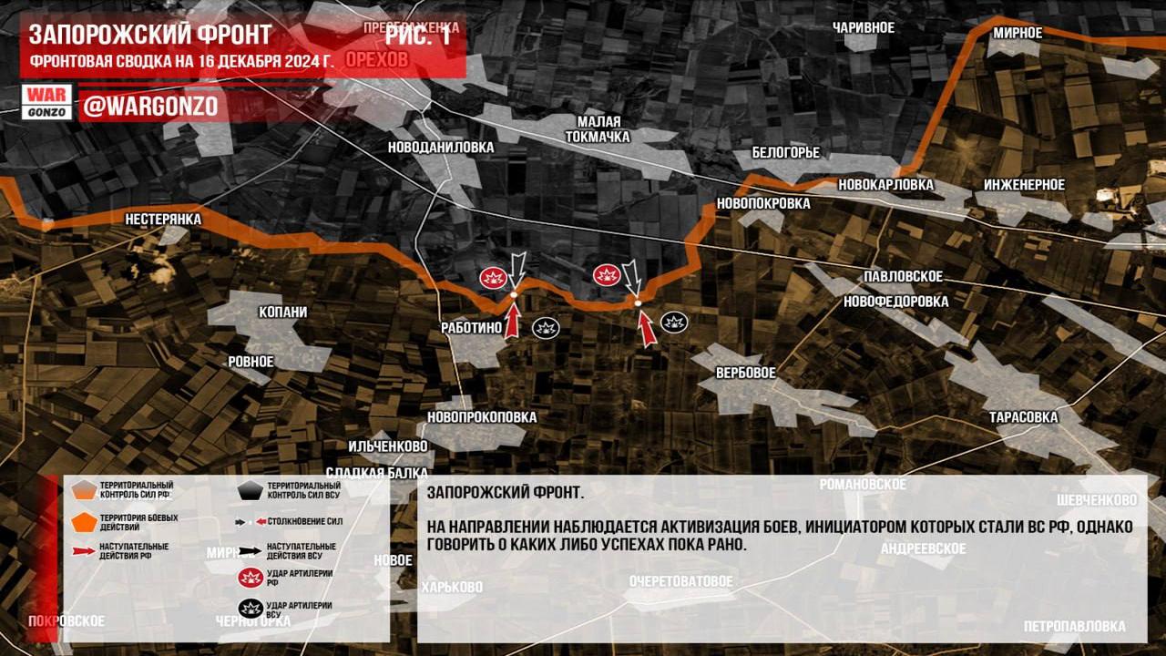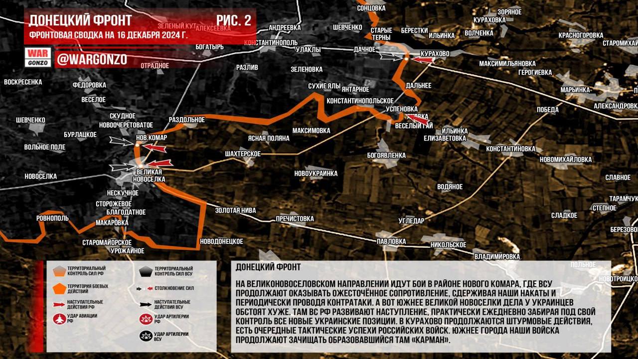 Ситуация на 16.12.2024 08:25. Канал Wargonzo сообщает: Фронтовая сводка на утро 16.12.2024. Запорожский фронт: на направлении наблюдается активизация боев, инициированная ВС РФ, однако об успехах говорить рано. Донецкий фронт: на Великоновоселовском направлении бои в районе Нового Комара сопровождаются ожесточённым сопротивлением со стороны ВСУ. Южнее Великой Новоселки украинским войскам труднее, ВС РФ развивают наступление и захватывают новые позиции. В Курахово продолжаются штурмовые действия, есть тактические успехи российских войск, а южнее города продолжается зачистка образовавшегося «кармана». Часовоярское направление: продолжаются бои в районе огнеупорного завода, важного для обороны ВСУ, но точных данных о продвижении российских войск нет.