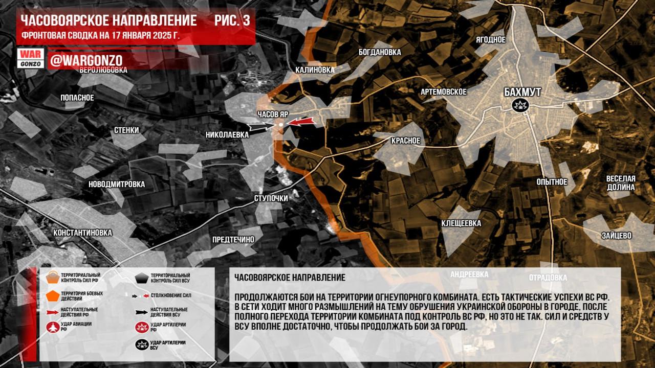 Ситуация на 17.01.2025 09:10. Юрий Подоляка сообщает: на 17.01.25 продолжаются штурмовые действия в центральной и южной частях Часова Яра. Он отметил, что отечественные войска атакуют южнее, в сторону микрорайона «Шевченко», что должно помочь в выходе на последние коммуникации украинских сил, удерживающих квартал высотной застройки. Подоляка написал, что после этого взятие оставшейся части города не составит больших проблем.