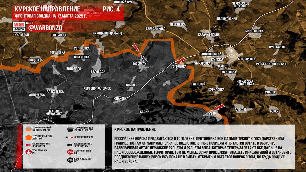 Канал Wargonzo сообщил о ситуации на фронте на утро 17 марта 2025 года. По информации канала, на Запорожском фронте продолжаются бои в районе Степового, Щербаков и Малых Щербаков, где российские войска ведут давление на оборону ВСУ, которые перебрасывают резервы для сдерживания атак. На Донецком фронте также отмечаются тяжелые бои, с усилением обороны ВСУ за счет свежих резервов, включая испаноговорящих наемников. Украинская армия активно контратакует, однако российские войска продолжают давление на позиции противника, замедляемое переброской дополнительных сил и активным использованием дронов. В Часовоярском направлении отмечены бои без значительных изменений. В Курской области российские войска продвигаются в Гоголевке, несмотря на укрепление обороны противника. Канал Wargonzo отметил, что российские войска продолжают владеть инициативой, но вопросы по дальнейшим действиям остаются открытыми.