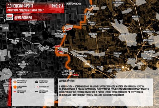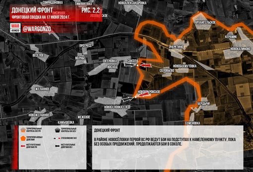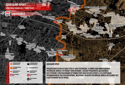 Боевые действия на Донецком фронте продолжаются возле Константиновки. Российские войска в Максимильяновке укрепляют свои позиции для последующего наступления и штурма. В Красногоровке также продолжают продвигаться, вытесняя украинские вооруженные силы из центральной части города. Кроме того, идут бои в Невельском, обстановка в Карловке остается напряженной, а в Яснобродовке ситуация без значительных изменений. В районе Новосёловки Первой ВС РФ продолжают наступление без существенных изменений, а также продолжаются бои в Соколе.