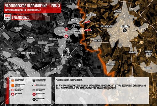 На Восточном фронте российские вооруженные силы, поддерживаемые воздушной атакой и артиллерией, продолжают наступление на Часов Яр. Самые ожесточенные бои разворачиваются в районе Богдановки.