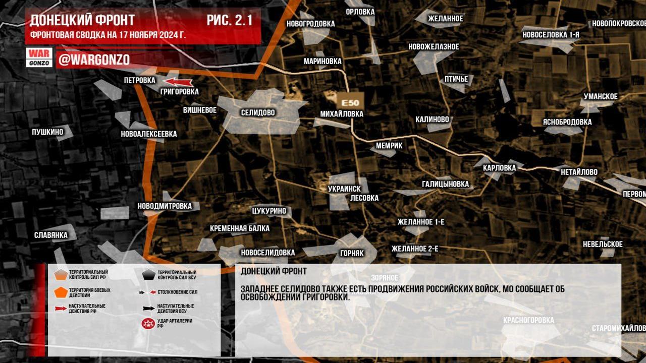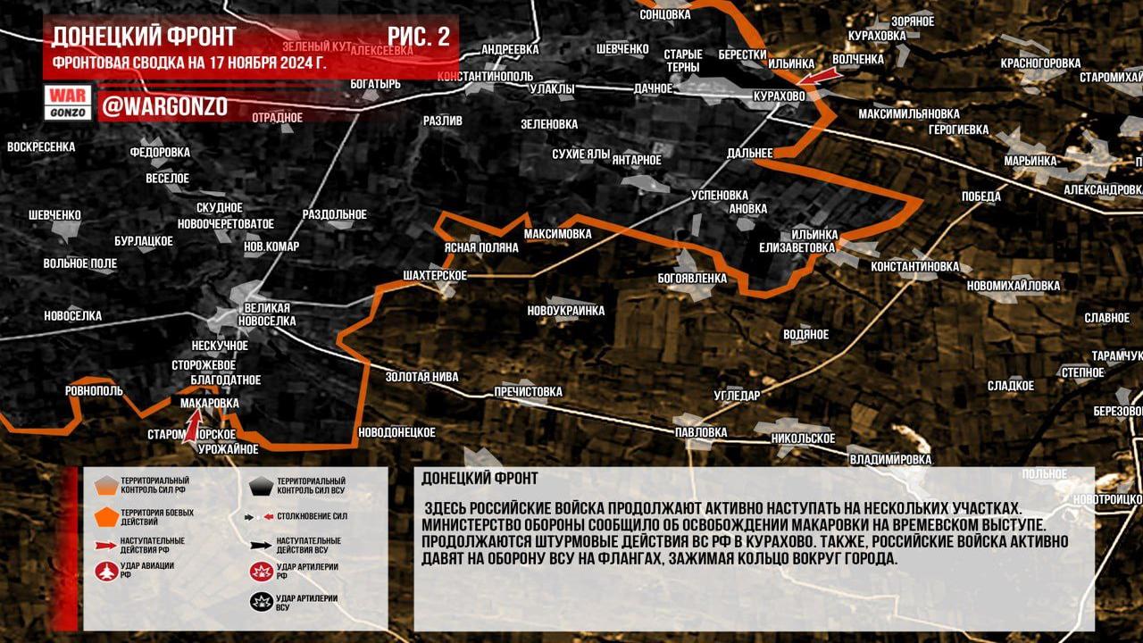 Ситуация на 17.11.2024 10:07. Канал Wargonzo сообщает: на утро 17.11.2024 ситуация на фронте следующая. На Запорожском фронте продолжаются позиционные бои без существенных изменений в линии боевого соприкосновения. На Донецком фронте российские войска ведут активное наступление на нескольких участках, Минобороны России сообщило об освобождении Макаровки на Времевском выступе. Продолжаются штурмовые действия в Курахово, также наблюдается давление на оборону ВСУ на флангах, что создает окружение вокруг города. Западнее Селидово зафиксированы продвижения российских войск, в частности, освободили Григоровку. На часовоярском направлении ведутся бои в городской черте Часов Яра и на флангах, где ВС РФ стремятся улучшить свои позиции. В Курской области также фиксируются тяжелые встречные бои, без значительных изменений в ЛБС, ВСУ продолжают перебрасывать резервы и технику в регион.