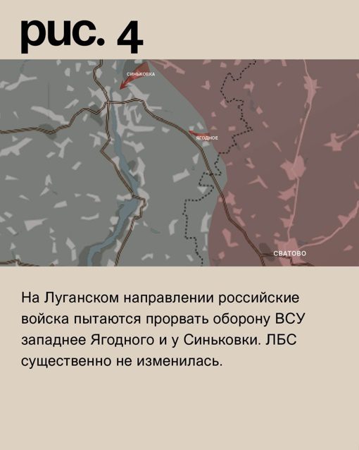 На Луганском направлении российские войска продолжают попытки прорвать оборону ВСУ западнее Ягодного и у Синьковки. Обстановка пока не изменилась существенно.