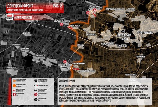 На Донецком фронте ВС РФ атакуют позиции ВСУ на разных участках, готовясь, возможно, к будущим штурмам. Ожесточенные бои продолжаются в нескольких населенных пунктах, где российские войска постепенно продвигаются вперед, хотя сталкиваются с сильным сопротивлением со стороны ВСУ. Соединенные усилия командования ВСУ нацелены на подготовку к новым контратакам.