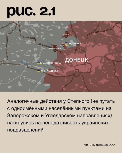 На Донецком фронте российские вооруженные силы, при поддержке артиллерии и авиации, смогли расширить зону контроля у Первомайского и Северного (населённый пункт к западу от Авдеевки). Однако, аналогичные действия у Степного столкнулись с сопротивлением украинских подразделений. ВСУ подвергаются атакам в Новомихайловке, Марьинке, Авдеевке, Ласточкине и Керамике, в то время как российские вооруженные силы находятся в Донецке, Водяном, Опытном и селе Красногоровка.