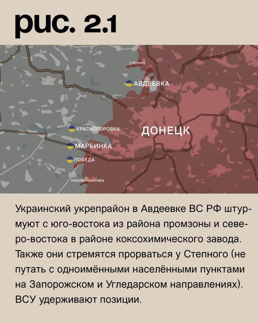 В районе Авдеевки российские вооруженные силы пытаются штурмовать украинский укрепрайон со сторон юго-востока (промышленная зона) и северо-востока (коксохимический завод). Они также пытаются прорваться в районе Степного. ВСУ успешно удерживают свои позиции.