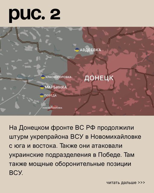 На Донецком фронте российские вооруженные силы предприняли штурм укрепленного района украинских сил в Новомихайловке с двух направлений — с юга и востока. Они также атаковали украинские войска в Победе. В этих районах украинская армия имеет хорошие оборонительные позиции, выполняя успешное сопротивление российским силам.