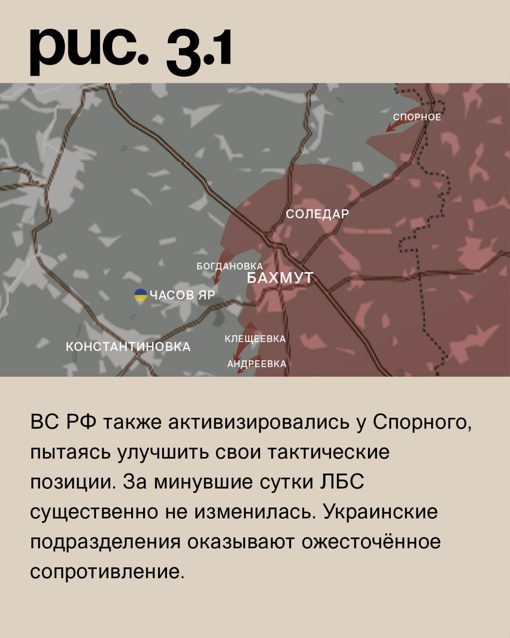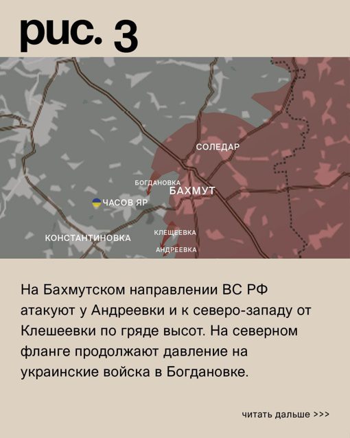 На Бахмутском (Артемовском) направлении российская армия атаковала в направлении Богдановки. Украинские войска в ответ продвинулись в районе Клещеевки. Бои также продолжаются в Андреевке, особенно у железной дороги.