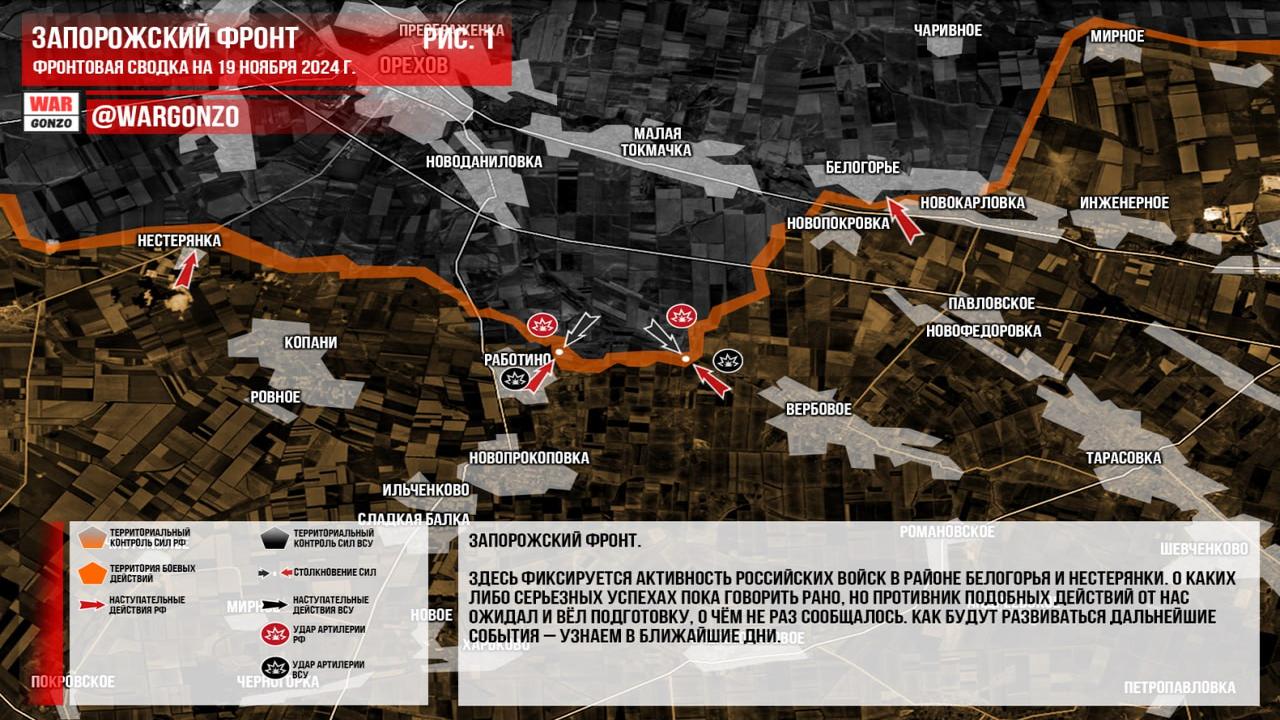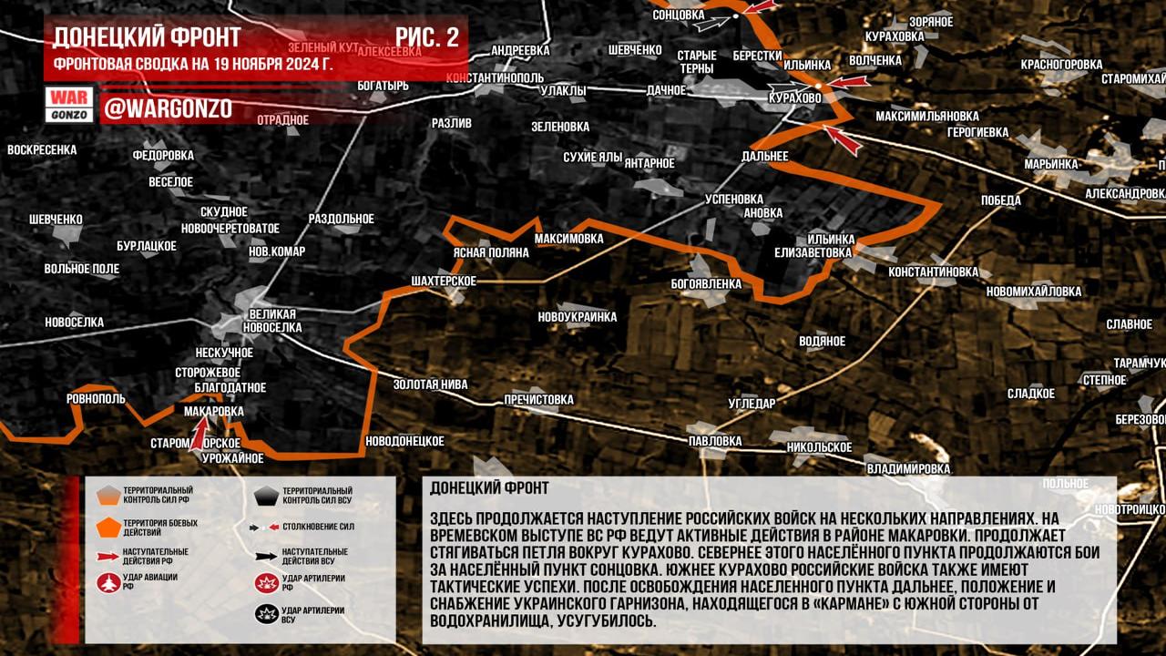 Ситуация на 19.11.2024 08:19. Канал Wargonzo сообщает: на утро 19.11.2024 фиксируется активность российских войск на Запорожском фронте в районе Белогорья и Нестерянки, однако серьезных успехов пока нет. На Донецком фронте продолжается наступление России в нескольких направлениях, включая активные действия на Времевском выступе и бои за Сонцовку. Продолжается стягивание вокруг Курахово, где положение украинского гарнизона ухудшилось после освобождения Дальнего. На Часовоярском направлении российские войска пытаются улучшить свои позиции, несмотря на контратаки ВСУ. В Курской области наблюдаются тяжелые бои, где украинские войска активно контратакуют, замедляя продвижение российских войск.