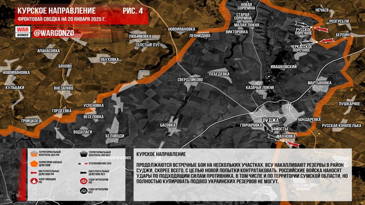 Ситуация на 20.01.2025 12:44. Юрий Подоляка сообщает: на Курском направлении 20 января 2025 года происходят встречные бои между сторонами, которые пытаются взять инициативу под контроль. Он отметил, что украинские силы продолжают атаки со стороны Новоивановки и Лонидово на Викторовку, в то время как противник движется в Махновке и районе Погребков и Сорочин. Подоляка написал, что с учетом улучшения погодных условий ожидается обострение ситуации на фронте с обеих сторон.