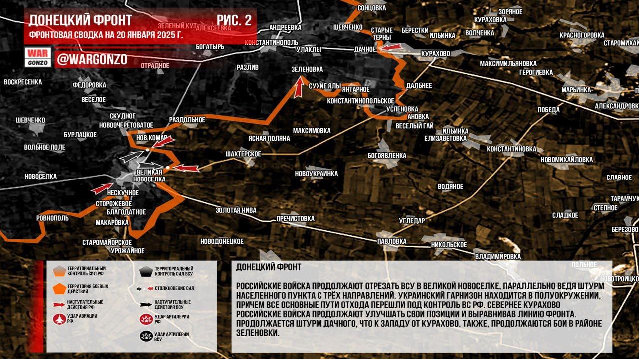 Ситуация на 20.01.2025 08:16. Канал Wargonzo сообщает: На утро 20.01.2025 ситуация на фронте остается сложной. На Запорожском фронте без существенных изменений, продолжаются позиционные бои и активная работа дальнобойной артиллерии с обеих сторон. На Донецком фронте российские войска продолжают отрезать ВСУ в Великой Новоселке и штурмуют населенный пункт с трех направлений, создавая полуокружение для украинских сил. Севернее Курахово россияне улучшают свои позиции, в то время как продолжаются бои в районе Зеленовки и штурм дачного. В Часовоярском направлении российские войска развивают наступление в Часов Яре с тактическими успехами. В Курской области продолжаются встречные бои, ВСУ накапливают резервы для новой попытки контратаковать, однако российские войска наносят удары по силам противника.