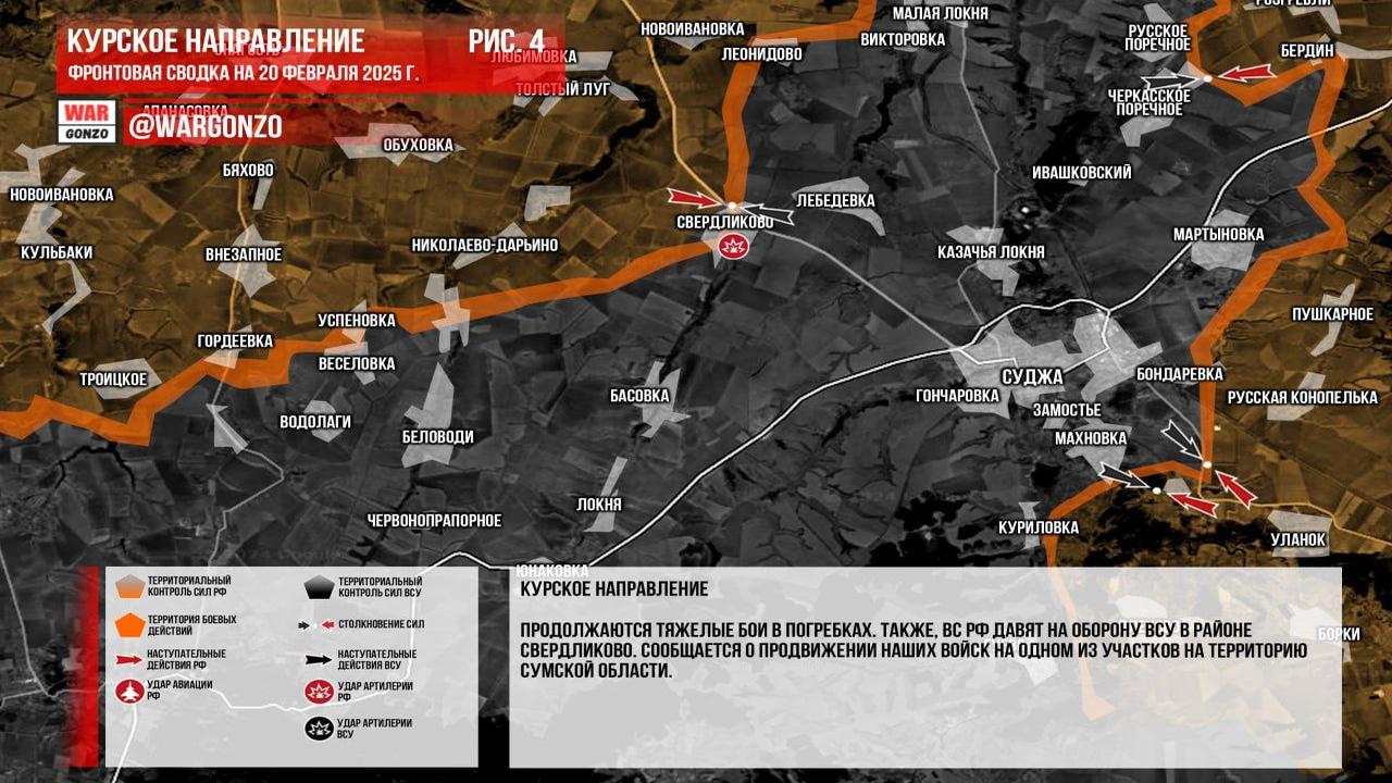 Юрий Подоляка сообщил о ситуации на Курском направлении на 20.02.25. Он отметил, что российские войска, развивая свой успех в районе Свердликово, вошли в Лебедевку и закрепились на позиции. Продолжаются атаки с целью полного контроля села, также отмечены успехи в этих действиях. Юрий Подоляка написал, что войска начинают усиливать давление южнее Свердликово и приблизились к Новенькому в Сумской области, где на утро были на северной окраине села. Бои ведутся тяжело, противник оказывает упорное сопротивление. В юго-восточном направлении продолжаются атаки в районе Куриловки и Гуево с тактическими успехами, однако также отмечается высокая сложность боевых действий. Также была попытка наступления южнее Гуево по направлению к Мирополью, которая оказалась безуспешной, но атаки продолжаются.
