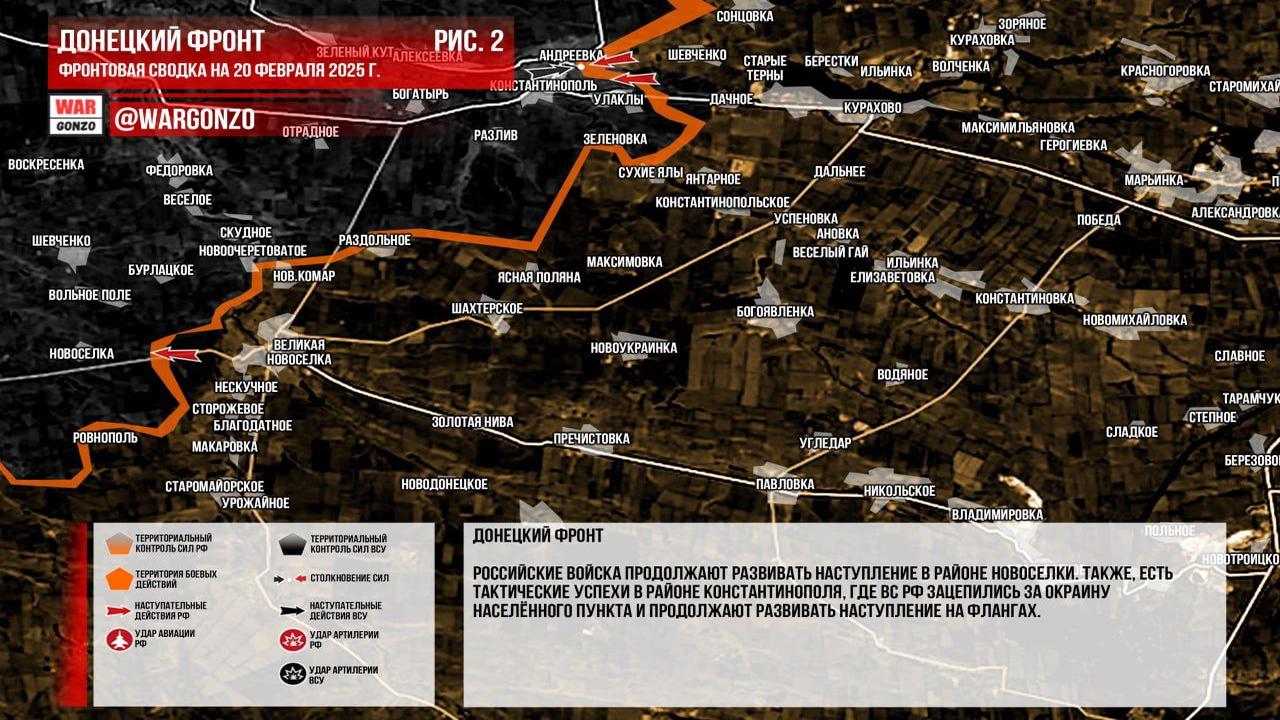 Канал Wargonzo сообщил о ситуации на фронте на утро 20.02.2025. На Запорожском фронте отмечается попытка контратаки ВСУ в Каменском, которая была отражена. На Донецком фронте российские войска продолжают наступление в районе Новоселки, а также добиваются успехов в районе Константинополя, где зацепились за окраину населённого пункта. В Часовоярском направлении российские силы продолжают давление на оборону в Часов Яре и развивают наступление на флангах, при этом отмечаются успехи в направлении Курдюмовки. В Курской области продолжаются тяжелые бои в Погребках, а также российские войска оказывают давление на оборону ВСУ в районе Свердликово и продвигаются на одном из участков в сторону Сумской области.