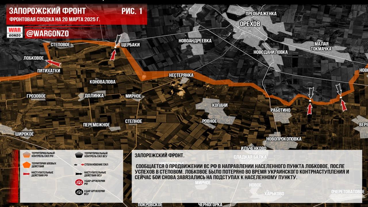 Канал Wargonzo сообщил о ситуации на фронте на утро 20.03.2025. На Запорожском фронте наблюдается продвижение ВС РФ в направлении Лобкового после успехов в Степовом, где возобновились бои. На Донецком фронте продолжается наступление ВС РФ к Богатырю, с ожесточённым сопротивлением ВСУ и встречными боями в районе Константинополя. Дронов противника становится больше, что компенсирует нехватку личного состава. В Дзержинске ВС РФ стремятся перекрыть логистику ВСУ и контролировать пути прорыва. На Часовоярском направлении активность боев высокая, но без существенных изменений. В Курской области российские войска ведут бои в районе Басовки, выбивая противника. В Белгородской области продолжается противостояние на стыке с Курской, с попытками ВСУ занять новые позиции. Артиллерия ВС РФ почти круглосуточно обстреливает украинские войска.