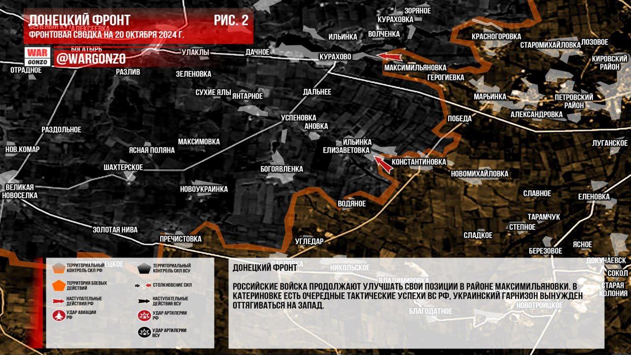 Ситуация на 20.10.2024 10:07. Канал Wargonzo сообщает: Фронтовая сводка на утро 20.10.2024. Сообщается, что на Запорожском фронте российские войска продолжают действовать севернее Работино и отмечается продвижение украинских войск к Новодаровке. На Донецком фронте российские войска улучшают свои позиции в районе Максимильяновки, а в Катериновке у них есть тактические успехи, что вынуждает украинский гарнизон оттягиваться. В Цукурино происходят встречные бои, где ВСУ пытаются вернуть утраченные позиции. В районе Селидово российские войска сжимают кольцо, однако погода и сопротивление ВСУ замедляют этот процесс. В Дзержинске продолжаются городские бои, и российские войска продолжают улучшать свои позиции южнее населённого пункта. На Часовоярском направлении бои продолжаются в микрорайоне Октябрьский, российские войска действуют на флангах. В Курской области российские войска продолжают продавливать оборону ВСУ, хотя на многих участках бои носят встречный характер, инициатива остается на стороне ВС РФ.