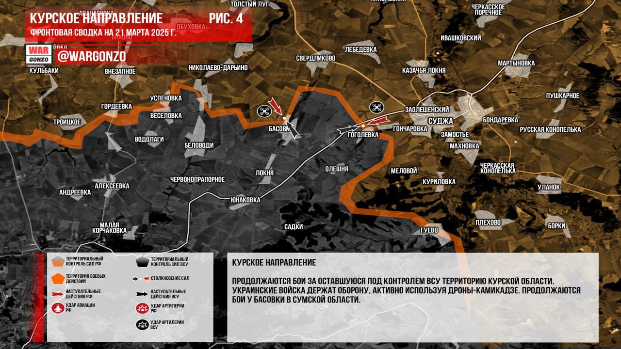 Юрий Подоляка сообщил, что на Сумском направлении продолжается упорное сопротивление противника на Юнаковском участке фронта, с попытками контратаковать позиции украинских сил. Он отметил, что в районе ППП «Суджа» произошли напряженные бои, где противник взорвал ГИС «Суджа», вероятно пытаясь замедлить продвижение украинских войск. Артиллерия активно работала, а небо заполнили дроны.