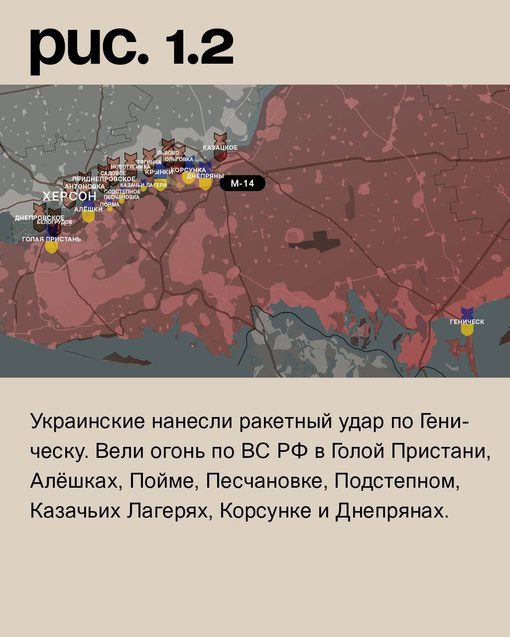 На Херсонско-Крымском направлении украинские морпехи с поддержкой артиллерии атаковали из Крынок на левом берегу Днепра и зашли в лесополосу у этого села. Их целью является выход к рокадной трассе М-14, что может создать серьезные проблемы для российских вооруженных сил. В ответ российские средства дальнего поражения нанесли удары по украинским войскам в нескольких населенных пунктах, включая Геническ. Украинские военные также ответили огнем по российским войскам в различных районах, включая Голую Пристань, Алёшки, Пойму, Песчановку и другие.