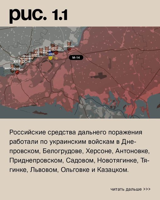 На Херсонском направлении противник, ВСУ, усилил свою группировку на левом берегу Днепра и занял лесной массив в районе Крынок. Несмотря на бомбардировки, противник продолжает снабжать свои войска через остров Фролова. В то же время, активность ВСУ увеличилась в районе Голой Пристани.