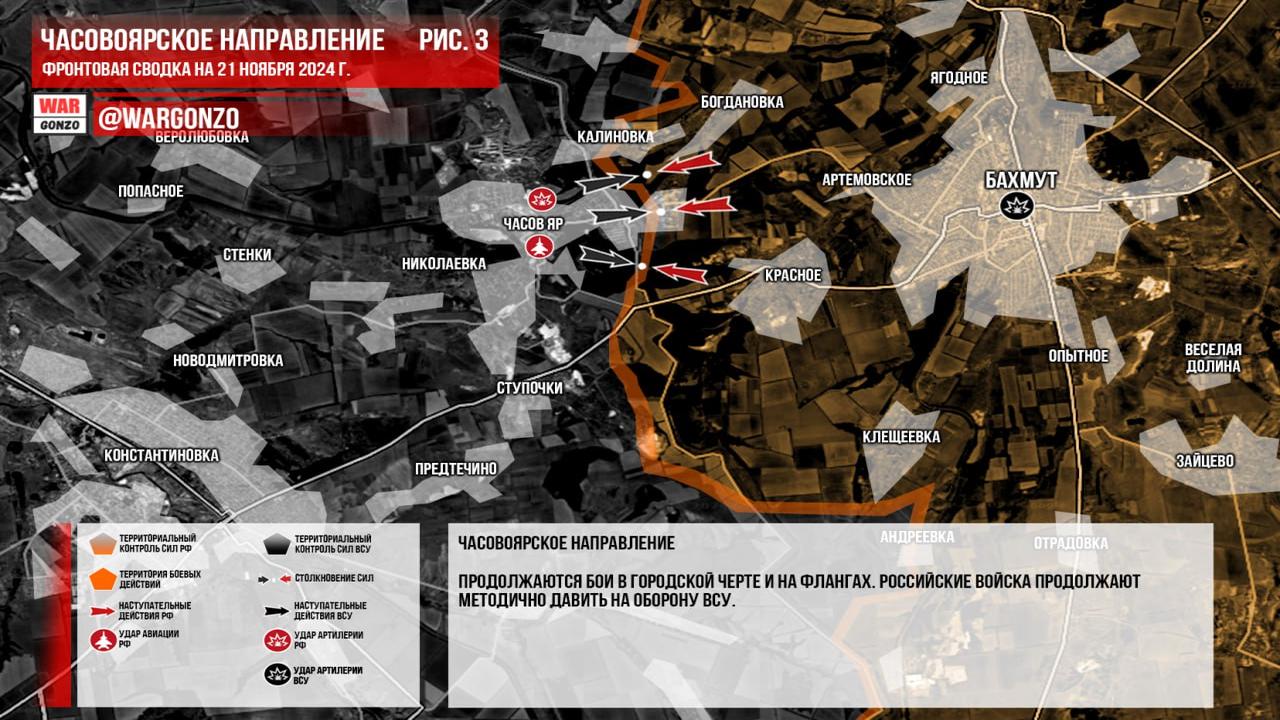 Ситуация на 21.11.2024 08:26. Канал Wargonzo сообщает: Фронтовая сводка на утро 21.11.2024. Запорожский фронт: Российские войска продолжают активность на Ореховском участке, отмечая небольшие продвижения. Донецкий фронт: После небольшой паузы, ВС РФ продолжили наступление в направлении Великой Новоселовки, достигнув тактических успехов в районе Урожайного и контролируя около 40% Курахово. Часовоярское направление: Бои продолжаются в городской черте и на флангах, российские войска оказывают давление на оборону ВСУ. Курская область: Отмечены продвижения российских войск в лесных массивах в районе Ольговки. Встречные бои продолжаются, ВСУ проводят контратаки, но успеха достичь не могут.