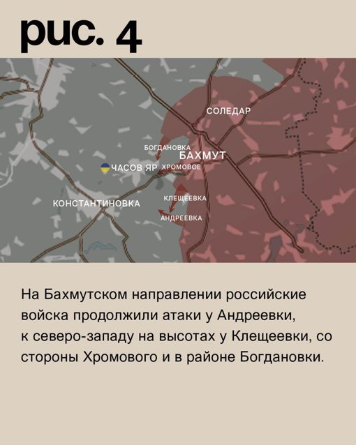 Ситуация на передовой в последние сутки выглядит следующим образом. В зоне Бахмутского (Артемовского) направления русская армия постепенно продвигается в сторону Богдановки и Артемовского. В районе Клещеевки украинские силы успешно атаковали высоты и также контратаковали у Курдюмовки.