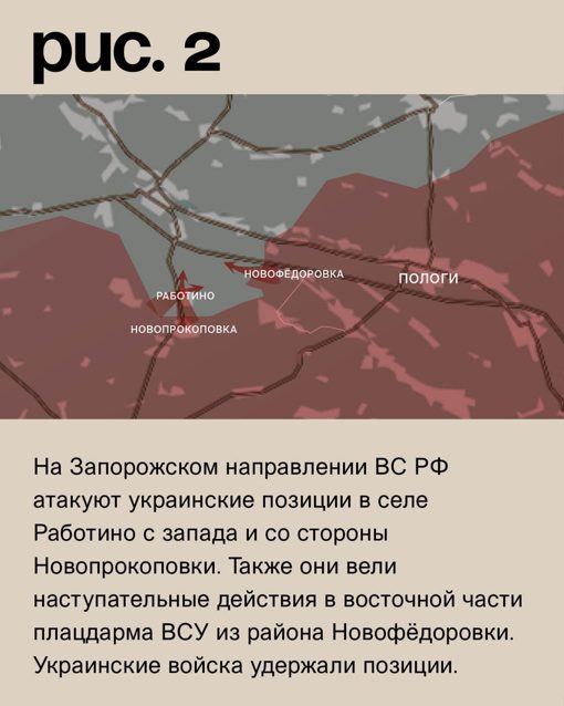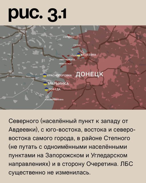 На Донецком направлении российские войска имеют локальные успехи как на юг, так и на север от Авдеевки. Благодаря грамотным штурмовым действиям они улучшили свою тактическую позицию. Также на Ореховском участке российская армия возвращает утраченные позиции в районе Вербового и западнее Работино, проводя зачистку украинских окопов.