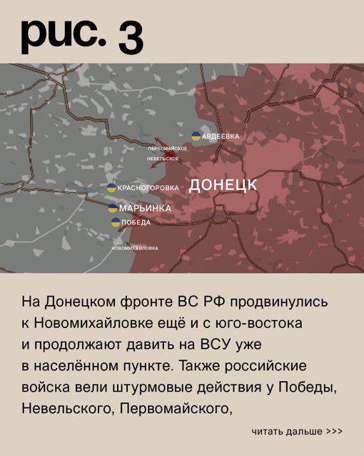 На Донецком фронте российские войска не только продвинулись к Новомихайловке с юго-востока, но и продолжают подавлять силы ВСУ уже в населенном пункте. Они также проводят штурмовые действия в разных районах, таких как Невельское, Первомайское, Северное, а также в сторону Очеретина. Общая обстановка на линии раздела существенно не изменилась.
