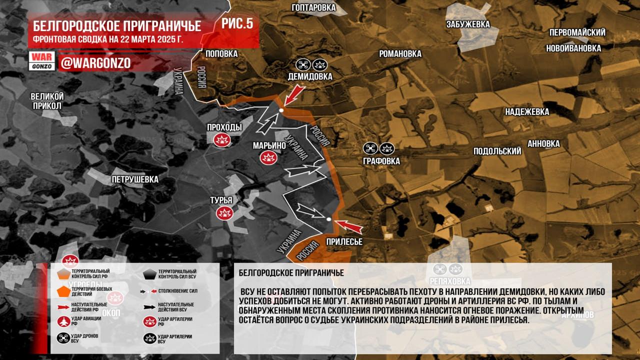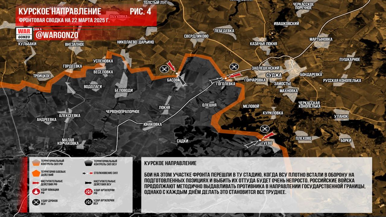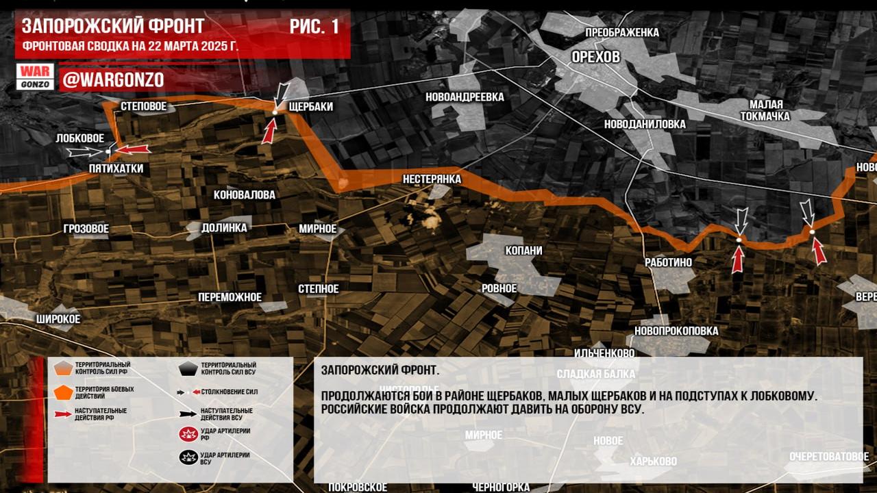 Канал Wargonzo сообщил, что на утро 22.03.2025 продолжаются бои на Запорожском фронте в районе Щербаков и Лобкового, где российские войска оказывают давление на оборону ВСУ. На Донецком фронте отмечены ожесточённые бои, российских войск пытаются вернуть инициативу, продвигаясь к Богатырю и имея тактические успехи в Успеновке. В районе Дзержинска ведётся работа по отрезанию логистики ВСУ. Канал Wargonzo написал, что на Часовоярском направлении произошёл прорыв российских войск в микрорайон Шевченко, с контролем западного посёлка, и продолжаются контратаки со стороны ВСУ. В Курской области бои перешли в стадию обороны ВСУ, затрудняющую дальнейшее продвижение российских войск в сторону границы. В Белгородской области каналы ВСУ направляют пехоту в сторону Демидовки, однако без успехов, в то время как российские дроны и артиллерия наносят удары по тылам противника.