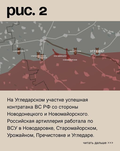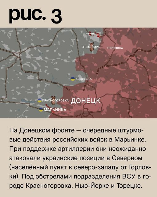 На Донецком фронте российские войска проводят новые штурмовые действия в Марьинке. При поддержке артиллерии они неожиданно атакуют украинские позиции в населенном пункте Северном, расположенном к северо-западу от Горловки. Подразделения ВСУ подвергаются обстрелам в городах Красногоровка, Нью-Йорк и Торецк.