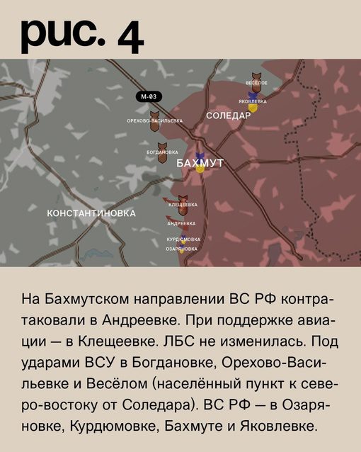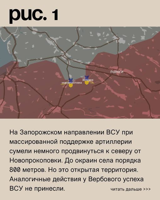 В направлении Запорожья ВСУ продолжают сталкиваться с сопротивлением на территории Вербового и Новопокровки, несмотря на контратаки российской армии во флангах. На Времевском выступе украинские военные безуспешно атаковали в районе Приютного.