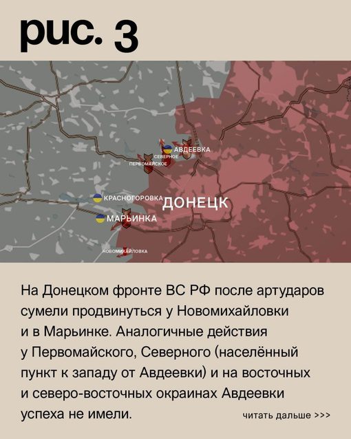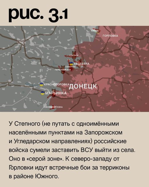 Во время артобстрелов на Донецком фронте российские вооруженные силы смогли продвинуться в Новомихайловке и Марьинке. Однако атаки на Первомайский, Северный и окраины Авдеевки не привели к успеху. В Степном российская армия вытеснила ВСУ из села, которое находится в «серой зоне». Продолжаются бои за территории к северо-западу от Горловки в районе Южного.