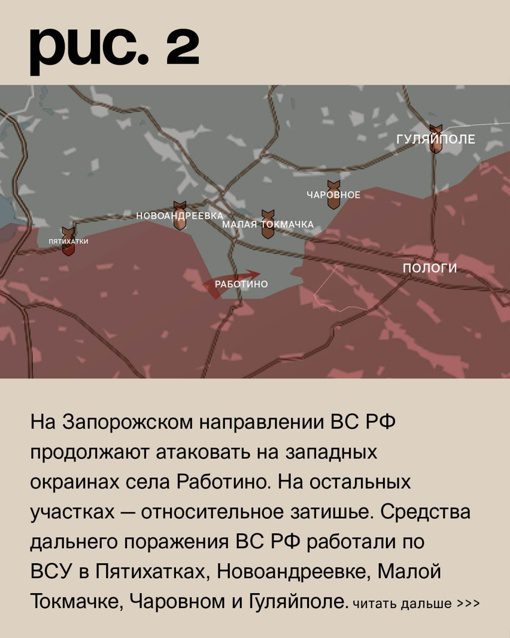 На Запорожском направлении российские войска продвигаются вдоль трассы на Малую Токмачку, где идут позиционные бои. Они также идут к бывшей зенитной части ПВО, чтобы обезопасить свой тыл. Основная цель — достичь микрорайона «Химик» с одновременным наступлением с Опытного.