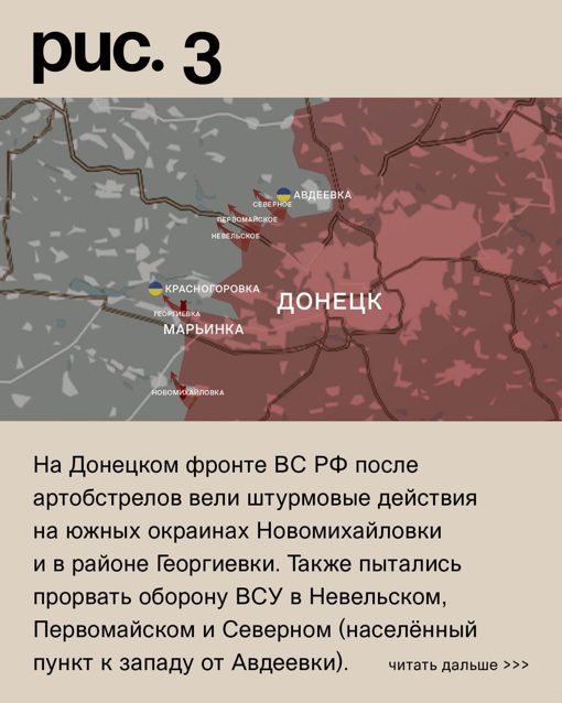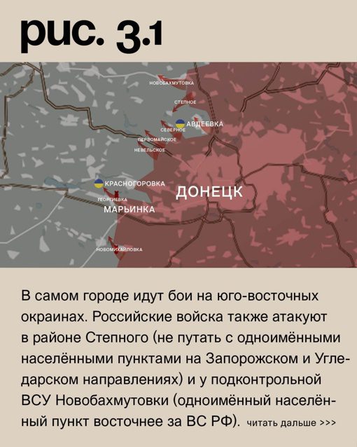 Российская армия продолжает атаковать на разных участках фронта. В Авдеевке они закрепились на южной окраине города и начали бои в городской застройке.
