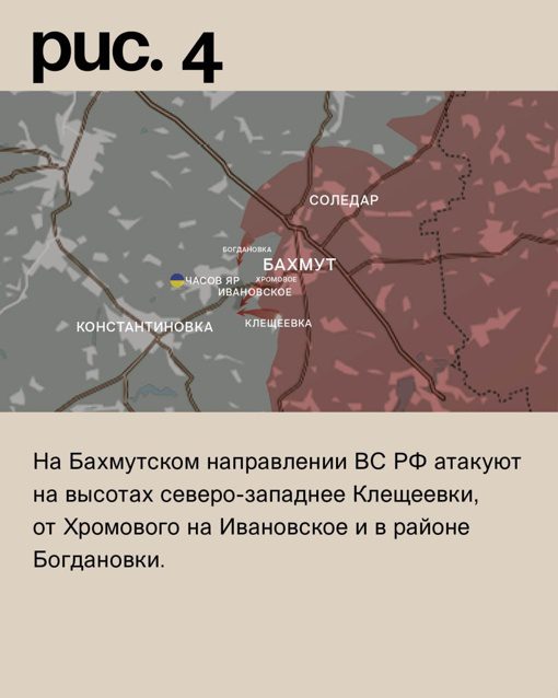 На Бахмутском направлении армия РФ атакует высоты северо-западнее Клещеевки, от Хромового на Ивановское и в районе Богдановки.