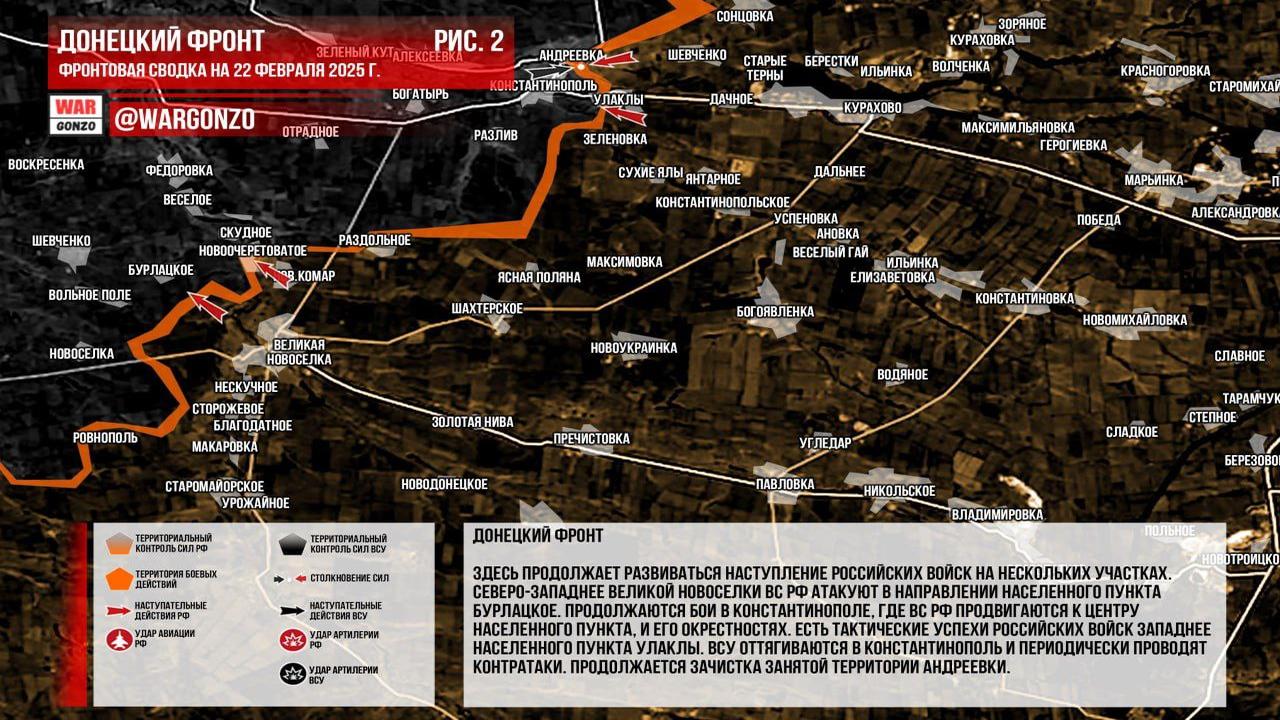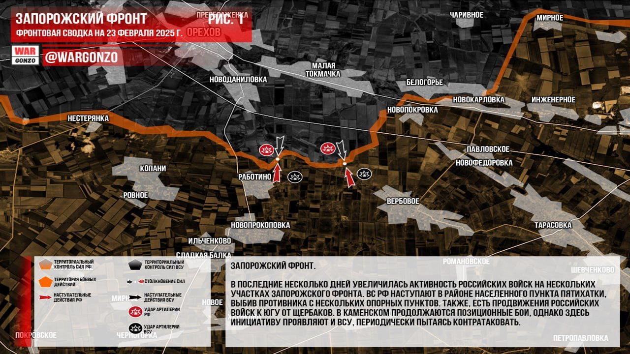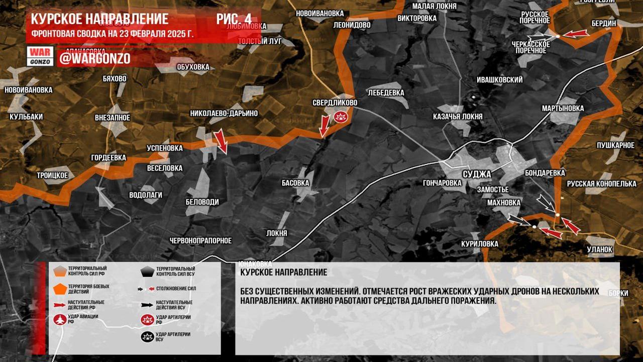 Канал Wargonzo сообщил, что на утро 23.02.2025 увеличилась активность российских войск на Запорожском фронте, где они наступают в районе Пятихаток и продвигаются к югу от Щербаков. В Каменском продолжаются позиционные бои с попытками контратак со стороны ВСУ. Канал Wargonzo отметил, что на Донецком фронте продолжается наступление российских войск, с атакой на Бурлацкое и боевыми действиями в Константинополе, где ВС РФ продвигаются к центру. Также есть тактические успехи западнее Улаклы, а ВСУ периодически проводит контратаки. В Часовоярском направлении не наблюдается существенных изменений, продолжаются штурмовые действия. В Курской области изменений нет, отмечается рост использования вражеских ударных дронов и активная работа средств дальнего поражения. Канал Wargonzo написал о росте военной активности на различных участках фронта.