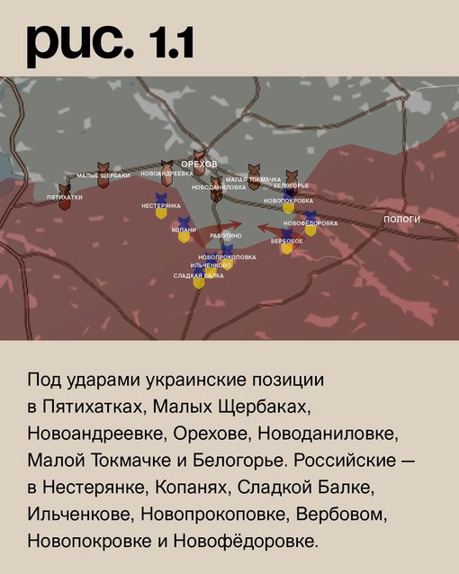 На Ореховском участке Запорожского направления происходят ожесточенные бои у Вербового, где наши силы удерживают оборону. Русская армия продвинулась в районе Приютного на Времевском выступе и провела контратаку у Полтавки. В то же время ВСУ атаковали у Новодонецкого.