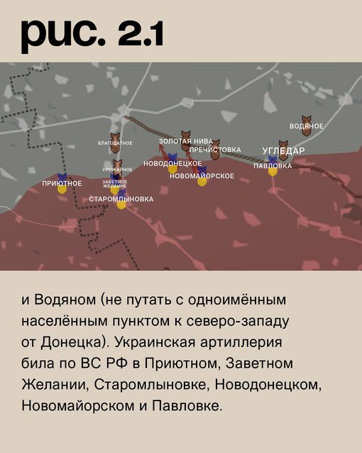 Украинская артиллерия обстреляла российские вооруженные силы в Приютном, Заветном Желании, Старомлыновке, Новодонецком, Новомайорском и Павловке.