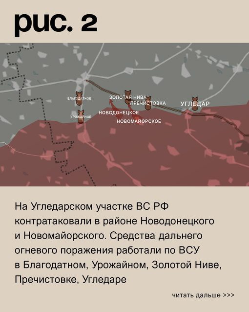 На участке вблизи Угледара российские вооруженные силы провели контратаку в районе Новодонецкого и Новомайорского. Силы дальнего огневого поражения нанесли удары по украинским вооруженным силам в Благодатном, Урожайном, Золотой Ниве, Пречистовке, Угледаре и Водяном (не путать с одноименным населенным пунктом к северо-западу от Донецка).