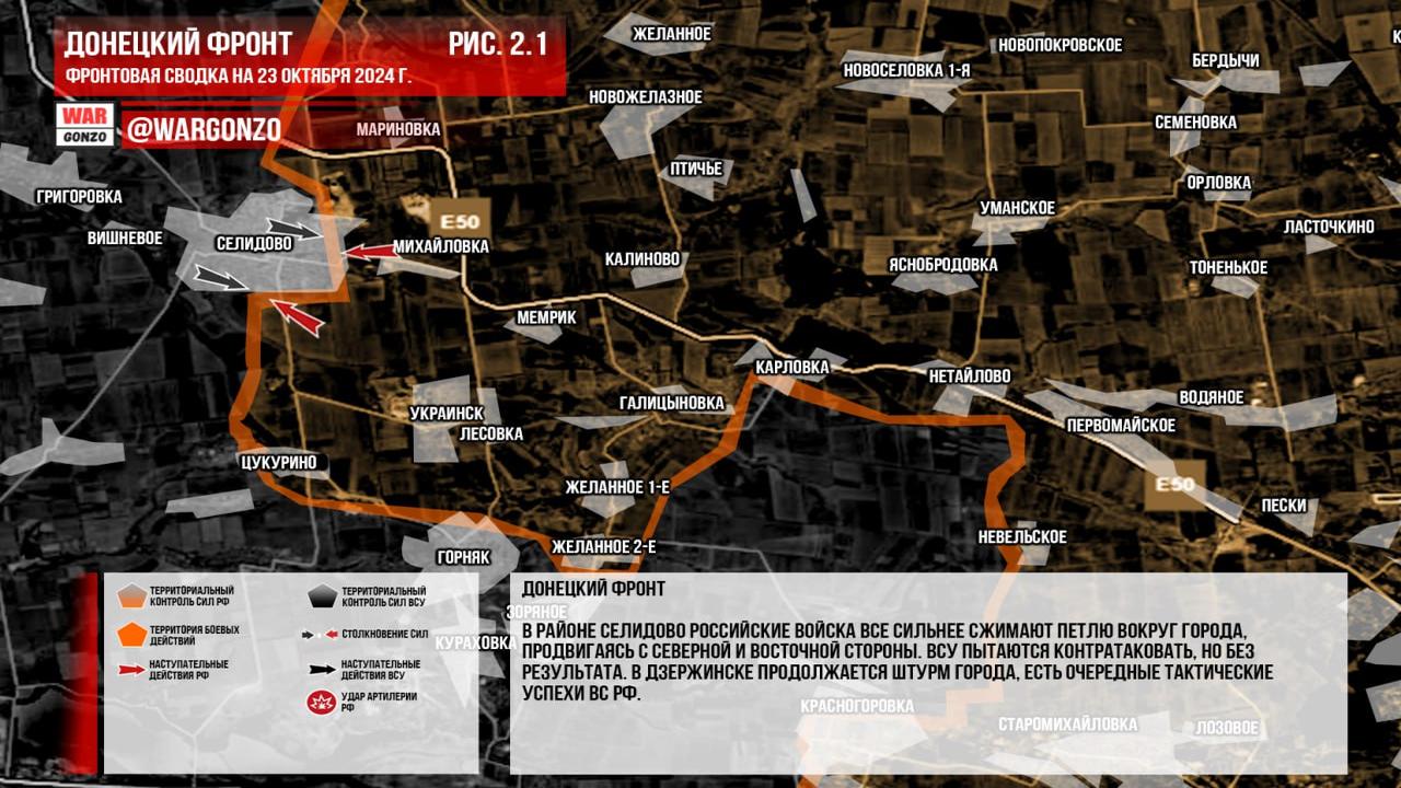 Ситуация на 23.10.2024 08:27. Юрий Подоляка сообщает: Штурм Селидово продолжается уже двое суток, и наши части добились значительных успехов, заняв восточную и южную части города. Противник проводит контратаки, и фронт остается в динамическом состоянии. По данным, наши войска контролируют комплекс медицинских учреждений в южной части города и продвигаются к последней дороге снабжения на Покровск. Также сообщается о боях на окраине села Новодмитровка, куда удалось пробиться южнее Селидово.