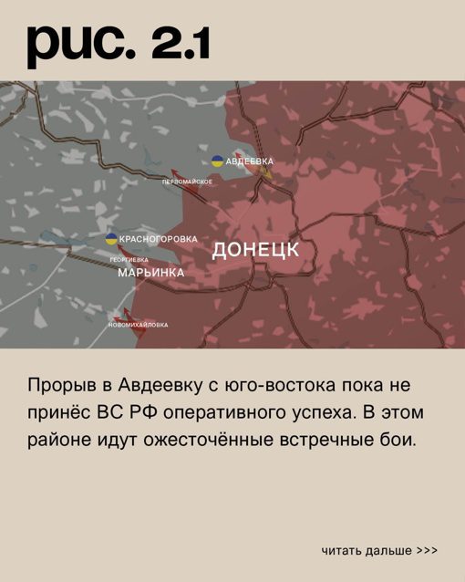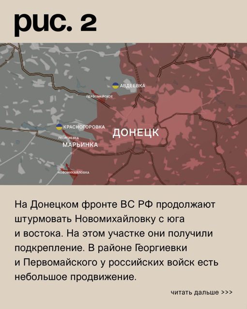 На Донецком фронте ВС РФ продолжают штурмовать Новомихайловку с юга и востока, получив подкрепление. В районе Георгиевки и Первомайского российским войскам удалось незначительно продвинуться. Прорыв в Авдеевку с юго-востока не принёс российским войскам успешных результатов, там идут ожесточённые бои. Такая же ситуация наблюдается в Степном (не путать с одноимёнными населёнными пунктами на Запорожском и Угледарском направлениях) и в Новобахмутовке, которая находится под контролем ВСУ (населённый пункт восточнее российских войск).