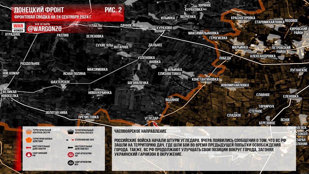 Юрий Подоляка сообщает: На утро 24.09.24 продолжаются бои на Угледарском направлении. Он отметил, что российские части успешно взяли под контроль шахту Южнодонбасская №3 и вошли в восточную часть города. Также продолжается давление на противника, что затрудняет снабжение украинского гарнизона. Подоляка написал, что противник, осознавая неизбежность потери Угледара, постепенно выводит свои наиболее боеспособные части, прикрывая отход теробороной и мобилизованными. Это обстоятельство может стать очевидным в течение ближайших дней по динамике штурма города.