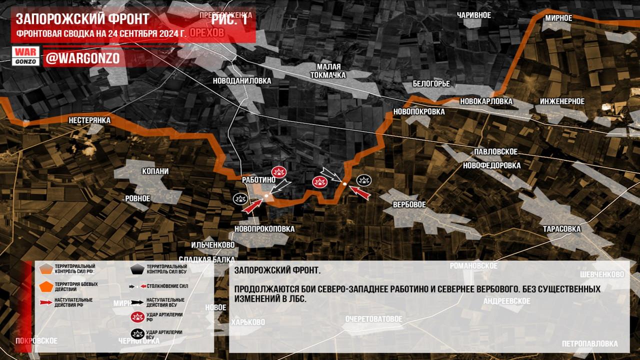 Запорожский фронт: боевые действия ведутся северо-западнее Работино и севернее Вербового. Существенных изменений не наблюдается.