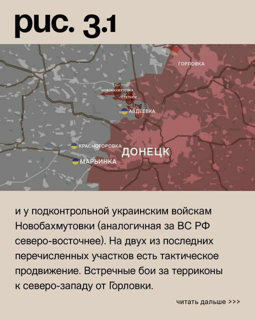 Северо-западнее Горловки ведутся бои за территорию. Наши войска пытаются занять высоты, чтобы продвигаться в город и одновременно создавать угрозу для российских подразделений, которые наступают на Авдеевку с северного фланга.