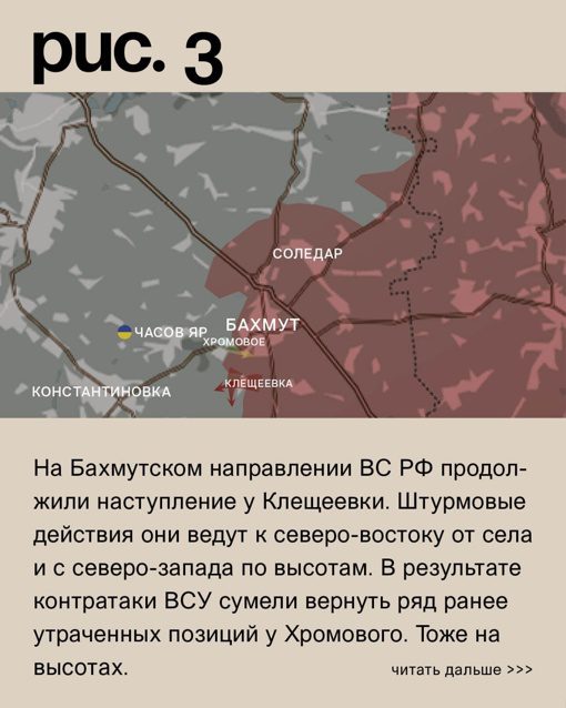 За последние сутки в зоне спецоперации обстановка такова: на Бахмутском (Артемовском) направлении русская армия продвинулась у Богдановки. В Клещеевке есть продвижение к северо-западу от села, а наши бойцы атаковали у Андреевки.
