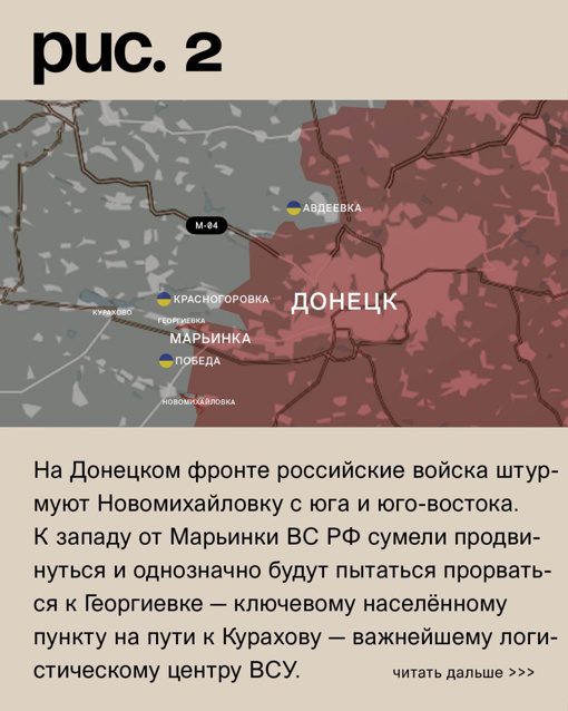 На Донецком фронте российские войска наступают на Новомихайловку с двух направлений — с юга и юго-востока. На западе от Марьинки они удалось продвинуться и теперь пытаются прорваться к Георгиевке, которая является ключевым населенным пунктом на пути к Курахову, важному логистическому центру Вооруженных Сил Украины.