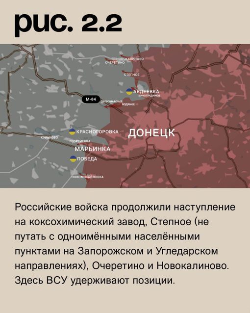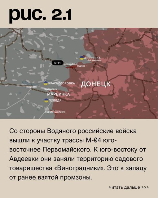 Со стороны Водяного российские войска достигли участка трассы М-04, который находится юго-восточнее Первомайского. В юго-восточной части Авдеевки они заняли территорию садового товарищества «Виноградники», расположенного на западе от промзоны, которую ранее удалось захватить. Российские войска продолжают наступление на коксохимический завод, Степное, Очеретино и Новокалиново. Вооруженные Силы Украины удерживают свои позиции здесь.