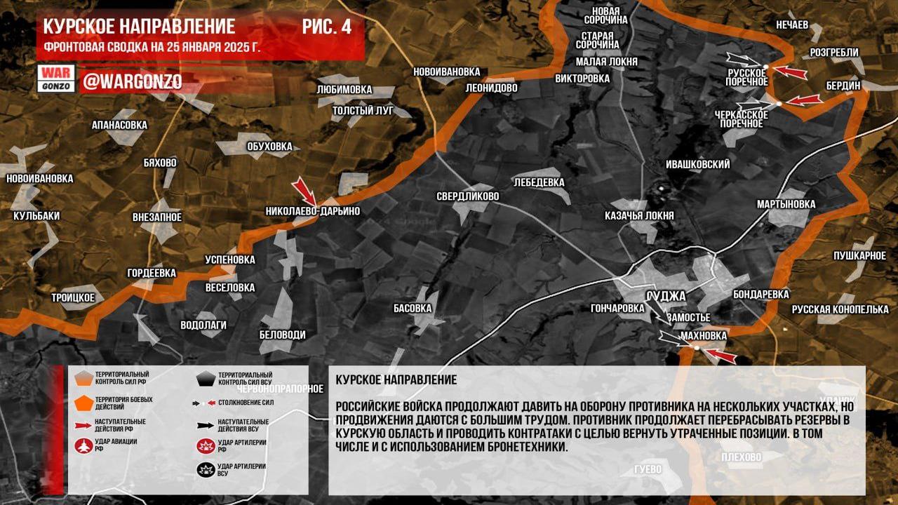 Ситуация на 25.01.2025 12:24. Юрий Подоляка сообщает: На Курском направлении 25 января 2025 года обстановка следующая. После прорыва на окраину Свердликово, наши части зачищали посадки юго-восточней Николаево-Дарьино и южнее Леонидово. Командование стремится занять линию реки Локня-Малая Локня для продвижения на Суджу. Также сообщается о тактических успехах севернее Черкасского Поречного, что может говорить о подготовке штурма. Небольшие успехи зафиксированы южнее Суджи. Однако разведка указывает на возможные планы противника относительно нанесения удара в приграничье, включая районы Глушково-Коренево и западную Белгородщину. Подоляка надеется, что военное командование видит угрозу и готовится к отражению.