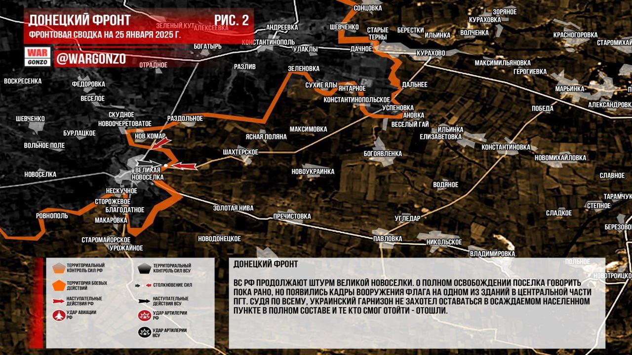 Ситуация на 25.01.2025 10:07. Канал Wargonzo сообщает: на утро 25.01.2025 обострение боевых действий на нескольких фронтах. Запорожский фронт остаётся без существенных изменений, однако противник активно использует дроны-камикадзе. На Донецком фронте продолжаются штурмовые действия в Великой Новоселке, где замечены кадры с флагом России, что указывает на частичное отступление украинского гарнизона. В Часов Яре отмечаются продвижения российских войск. В Курской области российские войска продолжают давление на оборону противника, несмотря на трудности с продвижением, в то время как противник перебрасывает резервы и проводит контратаки с использованием бронетехники.