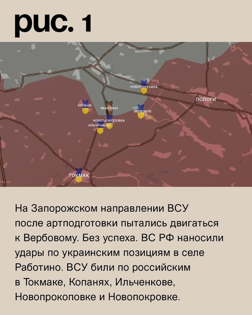 На Запорожском направлении ВСУ удалось приблизиться к Новопрокоповке и Вербовому, но российские военнослужащие продолжают удерживать оборону в обоих населенных пунктах. В то же время, на Времевском выступе ВСУ пытаются прорваться к Старомлыновке.