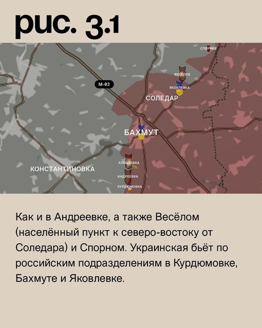На Бахмутском направлении российские войска сталкиваются с попытками ВСУ прорвать их оборонительные рубежи у железной дороги в районе Клещеевки. В ответ на это, артиллерия ВС РФ активно атакует позиции украинских сил в Андреевке, Весёлом и Спорном. В свою очередь, украинская армия наносит удары по российским подразделениям в Курдюмовке, Бахмуте и Яковлевке.