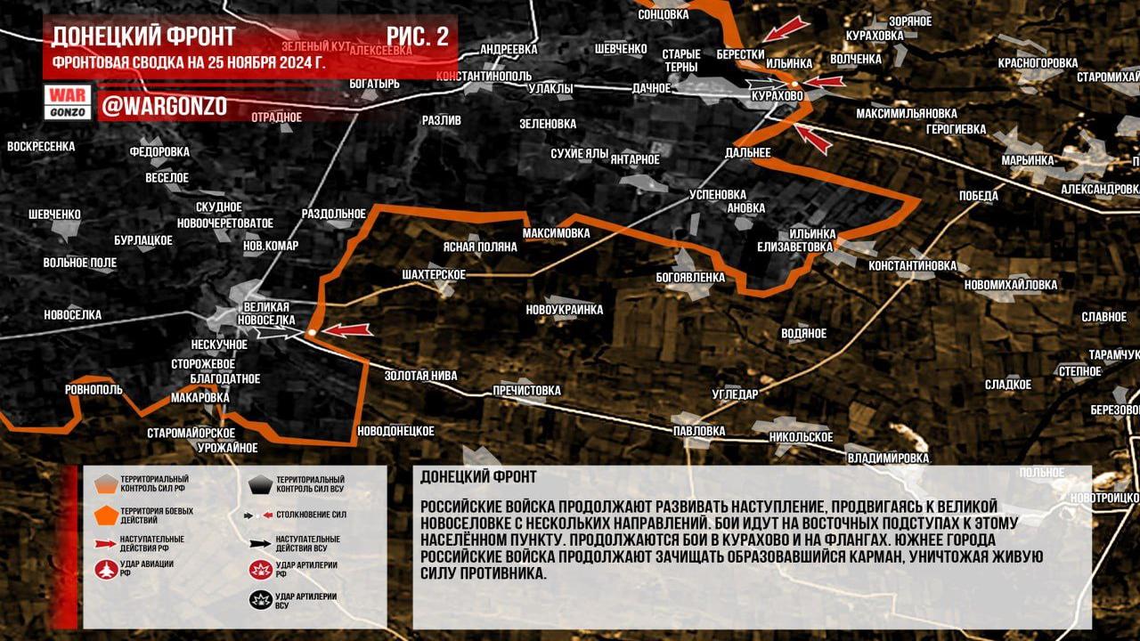Ситуация на 25.11.2024 08:17. Канал Wargonzo сообщает: Фронтовая сводка на утро 25.11.2024. На Запорожском фронте российские войска давят на оборону противника и продвигаются в направлении города Орехов, при этом завязав бои в Белогорье. На Донецком фронте продолжается наступление к Великой Новоселовке с нескольких направлений, идут бои на восточных подступах, а также в Курахово и на флангах, где российские войска зачищают образовавшийся карман. В Часовоярском направлении продолжаются бои в Часов Яре и на флангах, без существенных изменений в линии боевого соприкосновения. В Курской области российские войска проводят наступательные действия на нескольких участках, однако ВСУ оказывают упорное сопротивление и периодически проводят контратаки, без заметных изменений в линии боевого соприкосновения.